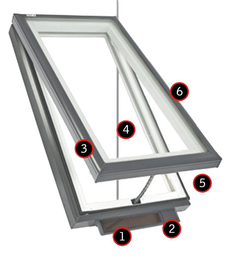Open and close your skylight with the power of the sun! Fitted with a solar panel, this skylight collects the sun's energy and uses it to open and close the skylight with a touch of a button.